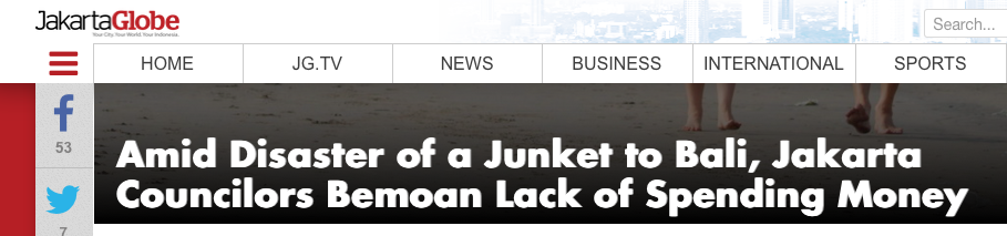 Contrast that experience with this story from the Jakarta Globe, about Jakarta politicians on a three day “study tour” to Bali. Thirty two Jakarta councillors felt the need to learn from Bali, and eight staffers went to dance attendance on them. This one paragraph says it all: